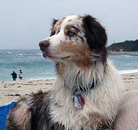 Copper, enjoying a day at the beach, has the sweetest disposition you have ever seen.