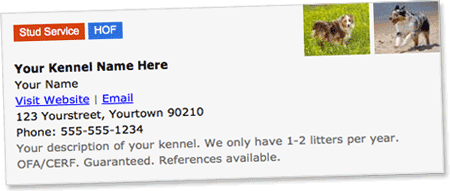 I've simplified and improved the Australian Shepherd Breeders Directory. As I mentioned above I need breeders to update their listings even if it's just to let me know that it's still current. We've now simplified our options. There is a full featured Premium Listing in a new cleaner format. It gives you live website and email links, new option to add "Stud Service" and/or "HOF" (Hall of Fame) icons, up to 2 photos (when you click on them they pop open a larger version), Puppy Announcements on your listing (and inclusion on our new separate Puppy Announcements page). But that's just the beginning...