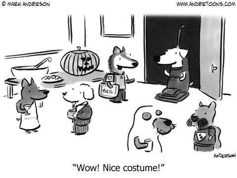 Speaking of being out of the yard—it might be best to leave them at home if you go out trick-or-treating. There is too much opportunity for an unexpected aggressive response from your dog. This can be especially true if your dog also has a costume on and you encounter another dog. This can inhibit the usual signaling that goes on when dogs meet and result in a fight.