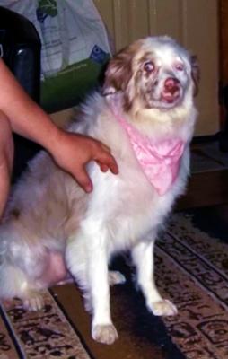 If interested the little background we know is she was dropped in a wooded area in December here in Ohio. After months of reports of a loss sheep, which one man took a shot at, the local dog pound was finally able to catch her using traps. They didn't catch her until April. She has what my vet called start point pupils and has to wear sun glasses when in the sun because they don't close quickly enough and she could suffer damage or even get cancer. She has 2 sisters, our 13 year old rescue that has been with us since 3 months old and another new addition to our family a 9 month old Chow mix. They all get along extremely well.