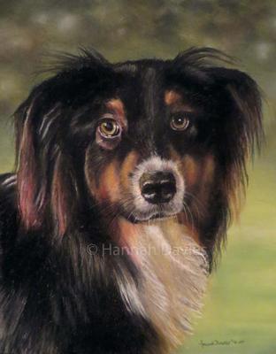 The dog was sat indoors but I choose to paint him outside. I had to alter the lighting on his coat to reflect sunlight.