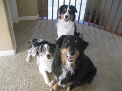 I have 3 Aussies. Bear (front right) only barks if there is a real threat. Ozzie (in the back) barks at anything and everything. Maggie (front left) barks when Ozzie barks. I've tried everything. It's so crazy at our house they bark if one of us comes down the stairs, if we have company over they bark everytime company gets up to move around!!! Any noise will set the two off. Any ideas on how to stop the 2 Aussies from barking all the time?