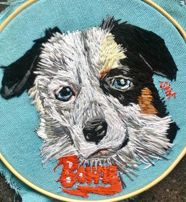 Traditional fiber art embroidery on cotton. I use different colors to achieve a more dimensional portrait. This one will be framed and hung above Bowie’s "place"...his bed and dog bowls.