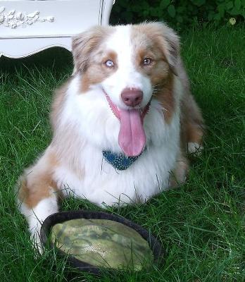 Typical Aussie, more energy than he knows what to do with, Frisbee is his game. Loves swimming, hiking, Frisbee and riding in the car. He is with us 24/7 and has never known any time in the past two years without us. His job is to keep us happy and entertained at all times. We rescued him from a family that couldn't handle him. He lived the first 10 months of his life in a crate, was not house broken or socialized. Now he knows about 15 tricks, dances on his back legs and is working on a dance routine. He is the light of our life, he found us just when we needed him. What a boy!