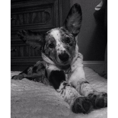 Chloe is an Australian Heeler, part Australian Shepherd and part Blue Heeler. Everybody who meets her falls instantly in love at the sight of her huge, pointy ears and at the sight of her polka-dotted tummy as she flops over for a belly scratch. She can run as fast as lightning and jump higher than any dog I've ever seen.