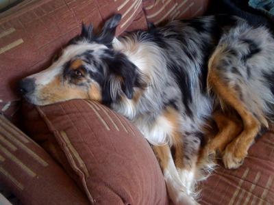 He has grown into a wonderful, smart, loving bubba of an Aussie. (See enclosed photo) he has learned to keep the free range cattle off our land, and many other services does he perform for us.