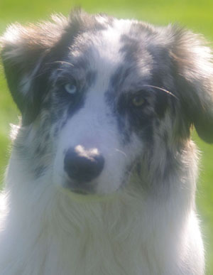 Misty is now nine months old and we are still scratching our heads as to whether she is a Red or Blue Merle. At 10 weeks when she came home it was obvious that she was a beautiful blue with no copper trim. Then her dark lips and nose began to get lighter. Soon dilute copper was coming through all over. She still looks blue at first glance but in the light she is red, her base hairs are grayish... and her nose is dark brown, not black. What do you think?