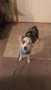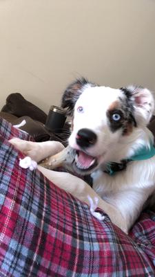 Now that we have him we don’t think he’s full Aussie due to his face being almost completely white except for a brown patch over one eye. He is mostly black, grey, and white with only a couple of brown spots.