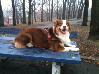 Now I gonna tell you something funny, and mayby verry "Aussie like." One day my son was out playing with her at a green area just near our home in the neighborhood where we live. Suddenly she started to bark a kind of bark that he never herd before. She sounded just like a little puppy. Then she ran away and my son of course got realy scared because she dont use to ever do that, and there are streets around. But she didnt run out of sight, she turned back and when she came back she was herding three wild rabbits! She had rounded them up in a perfect cirkle and came upp to him looking so proud that he couldnt get mad at her. Its like she said - "look what I got for you! They had split up but I braught them back!" She looked realy surprised when he leashed her and went home. So even if she is a city dog her herding instinkt is intact!