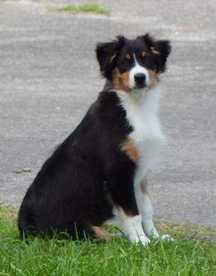 She is the apple of my husband's eye. Smart as a whip and is doing well in obedience, as all Aussies are. She prays to be a good girl, sits, weaves, does well on leash. We are hoping she gets over her thieving ways soon.