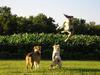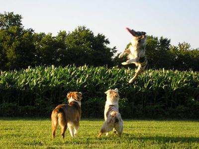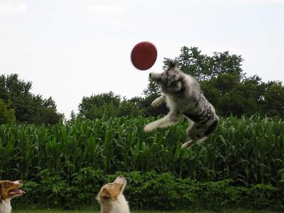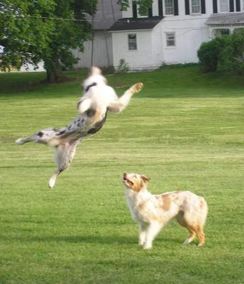 This is Maggie May. She can no longer do this, but boy could she fly and do backflips on command. She is now 16. Content to just chase toys with her sisters. I have 4. This is my second batch of Aussie's. Started with them at 14, I'm now 50.