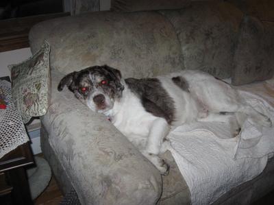He has become a real watchdog in the house, and makes up for his lack of vision with excellent hearing. He knows every car and motorcycle that goes by, and will literally grumble in his sleep if he hears a new one!