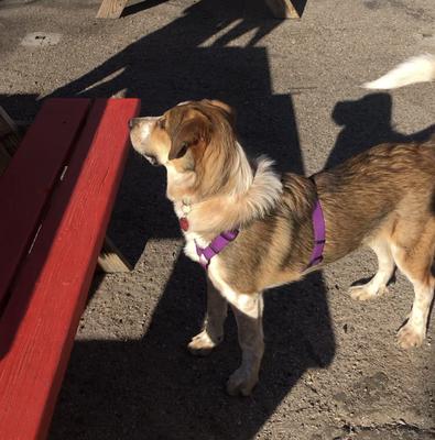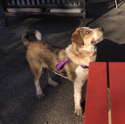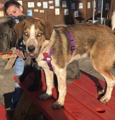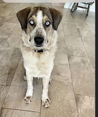 We just rescued this boy from in Northern AZ. Nothing is known about his parents. We were told he is about 6 months and 41lbs. Nico is still growing. He is very sociable with people, dogs, and cats! Brimming with energy and very inquisitive. Goofy and clumsy but very agile and athletic too. Piercing blue eyes, red merle on snout and legs, furry coat at neck but tightens some through hips.