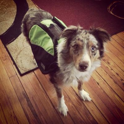 I took him backpacking once last summer at seven months old and he did very well but there is just a lot of dangerous snakes in the areas and copperheads that just made me uncomfortable with him being a puppy still. However, it only took him that one time to know what my backpack and his backpack meant we were going to go do.