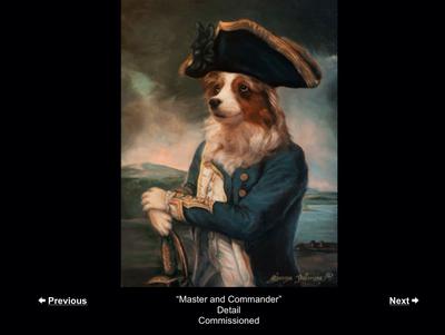 Hunter loves to run on the beach, so naturally when giving input to the artist, I simply asked for a seaside royal pet portrait. Hunter is now one of the immortal Master and Commanders of the sea;)